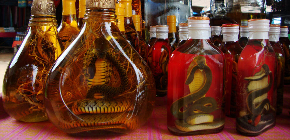 Also known as Snake Wine, the alcoholic base is made with sugarcane. It is left to ferment for about a month in an airtight container alongside with honey and mint. The resulting fermented liquid is then processed and moved to a rosewood barrel, where the alcohol is left to age for 5 more years.