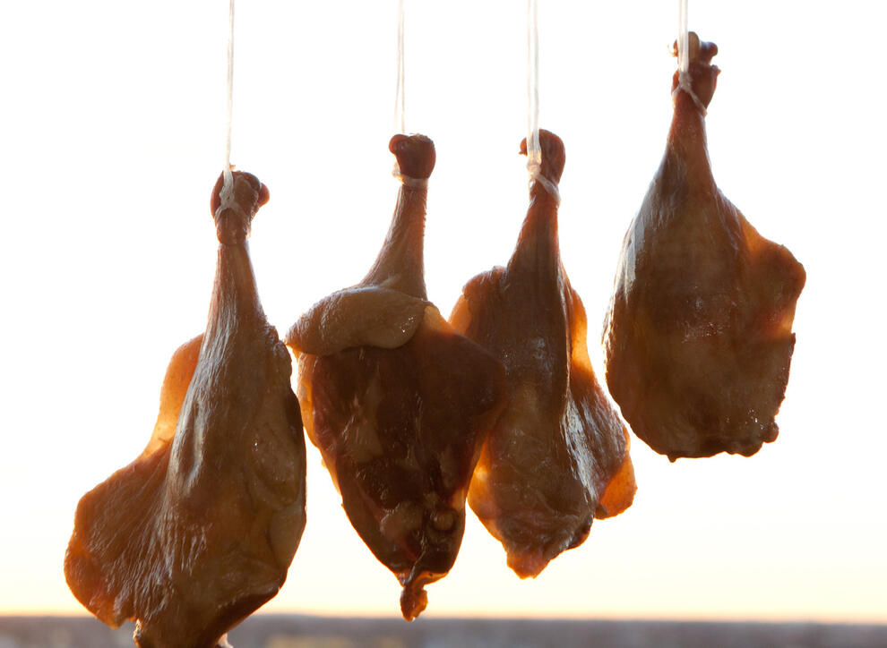 At the final stage, the entire bird is smoked for a crispy skin before the meat is ready for consumption. It is usually served along with stews or simply thinly sliced and wrapped on green leaves like crispy lettuce.