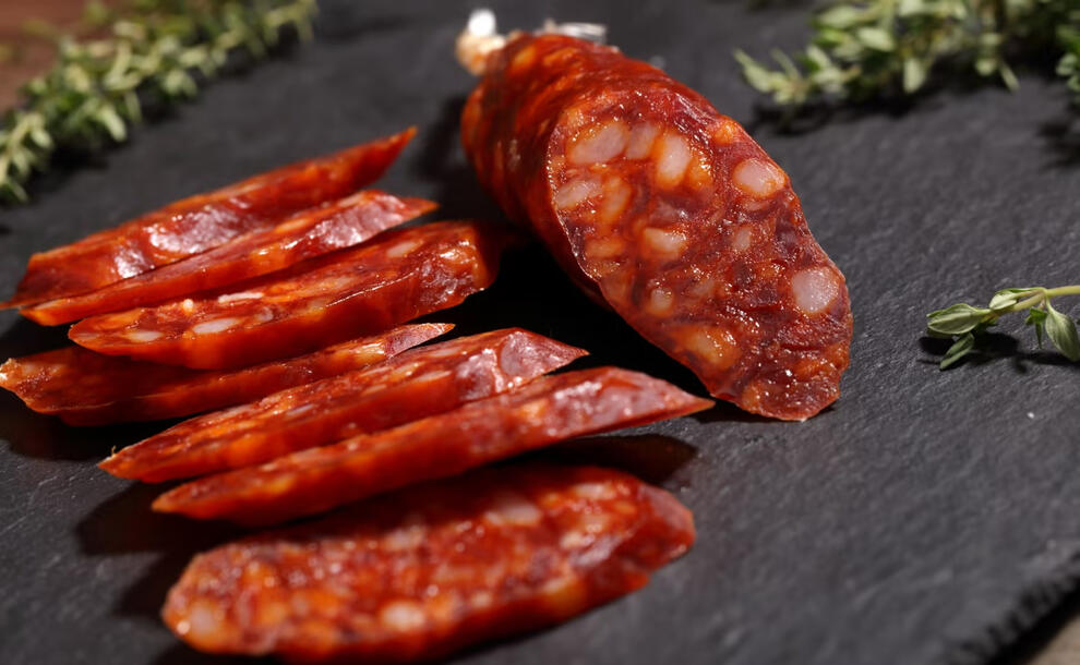 Cured meat made with a mix of spices and sugar. The meat and fat is diced and marinated on soy sauce, sugar, a special wine and finely ground fire peppers. When it's done marinating, the meat is ground and cased with a dash of honey, spices and pepper. The sausage passes on a secret cleaning method to avoid any mold and bacteria, and it's left to dry on air until the color inside is on a vibrant red.
