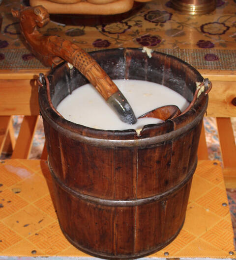 Kumis (Airag) is basically a Milk Vodka, made with milk curd. The vodka is distilled from the curd that is left to boil and the condensation from it is what makes the vodka. It is either stored away after done, left to a later use, or served right away after distilled.